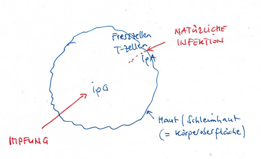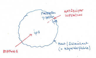 Im Unterschied dazu dringt bei der natürlichen Infektion das Virus an der Körperoberfläche in die Schleimhaut ein und aktiviert dort das sogenannte Schleimhaut-Immunsystem. Dort wird das Virus von „Fresszellen“ (Makrophagen, dendritische Zellen) angegriffen und eliminiert. Diese Fresszellen haben jedoch noch zusätzlich die große Bedeutung, dass sie die sogenannten T-Lymphozyten (T-Zellen) ganz gezielt gegen das eindringende Virus aktivieren. Und diese T-Zellen sind für die Entwicklung einer Langzeitimmunität vor allem gegen Viren von größter Bedeutung. Außerdem ist die Aktivierung der T-Zellen für die Bildung von Schleimhautantikörpern (IgA) notwendig. Und diese gegen das Virus gerichteten Schleimhautantikörper schützen uns einerseits schon an der Körperoberfläche zukünftig vor einem Eindringen der Viren in den Körper und andererseits aber auch unsere Umgebung vor einer Weitergabe dieser Viren.
